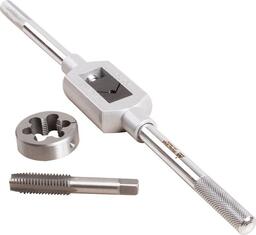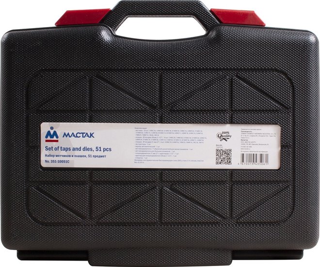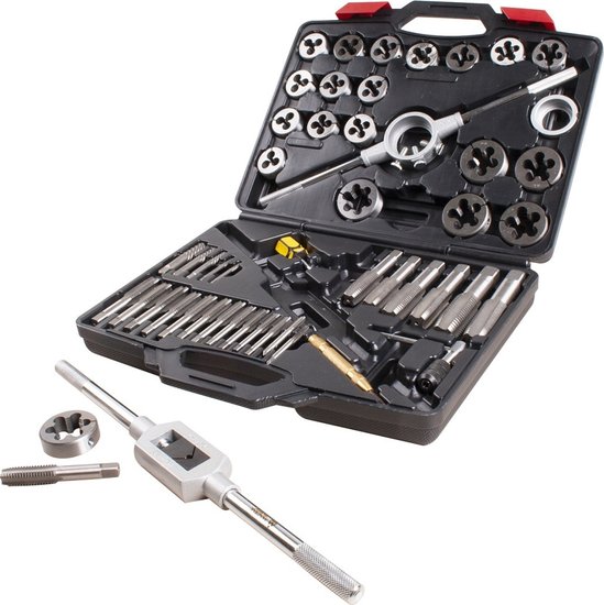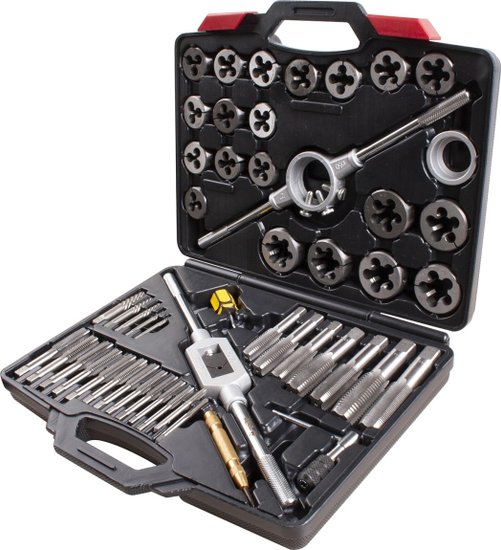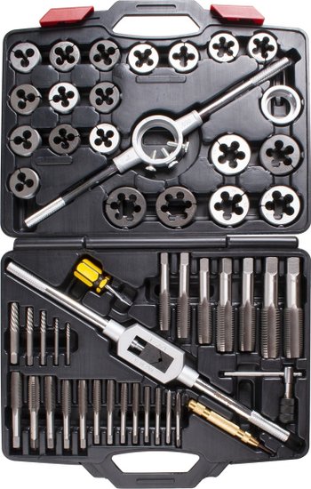 • Комплектация Метчики - 20 шт; Плашки - Ø посадки 38 мм (1-1/2") - 14 шт; Плашки - Ø посадки 51 мм (2") - 6 шт; Экстракторы - 5 шт; Кернер автоматический - 1 шт; Метчикодержатель с Т-образной рукояткой для малых размеров - 1 шт; Метчикодержатель для больших размеров - 1 шт; Плашкодержатель 51 мм (2") с адаптером 1-1/2" – 1 шт; Адаптер для плашкодержателя 38 мм (1-1/2") – 1 шт; Отвертка - 1 шт