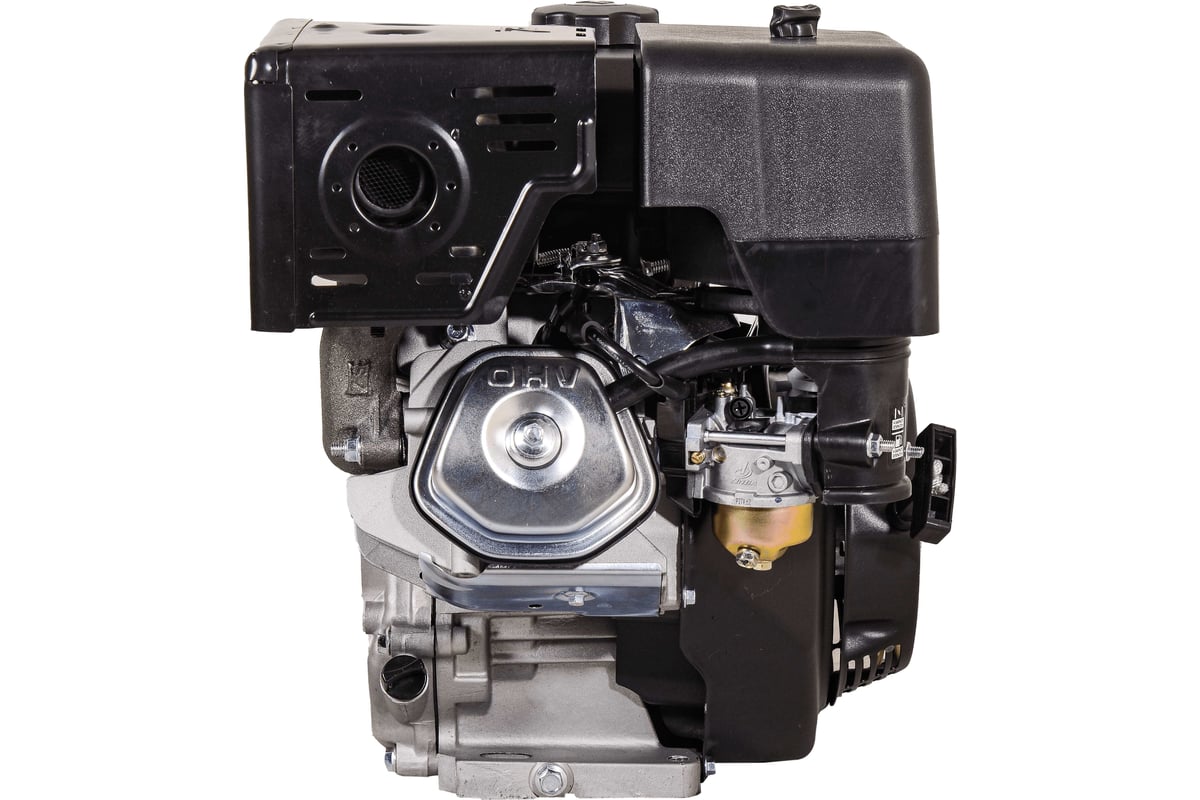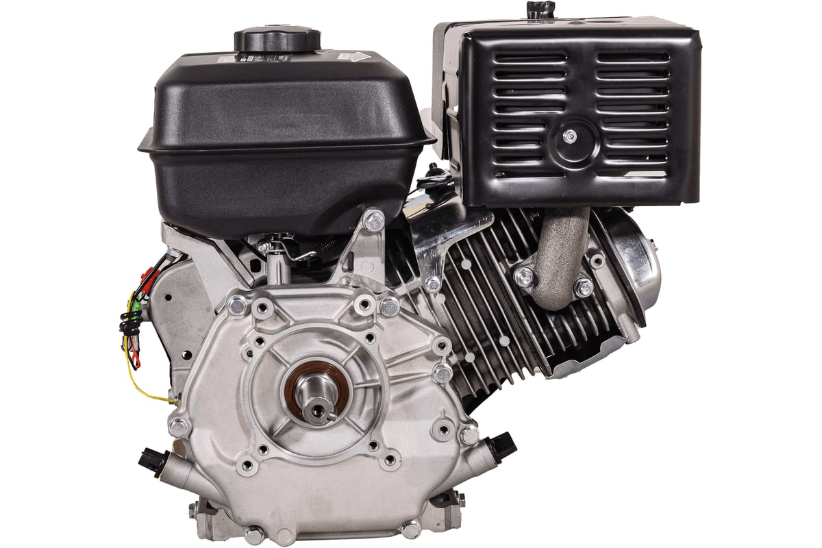 Четырехтактный одноцилиндровый силовой агрегат объемом 389 см³ с воздушным охлаждением работает на бензине 92 АИ. Вместительность топливного бака составляет 6 л. Модель оснащена ручным стартером. Наличие датчика масла предотвращает поломку установки при отсутствии или критически низком уровне масла, в этих случаях запуск невозможен или происходит автоматическая остановка агрегата. Двигатель имеет автоматический регулятор частоты вращения, благодаря чему упрощается работа оператора. Модель имеет усиленную конструкцию, цилиндропоршневая группа защищена хромированным покрытием. Прочный металлический коленвал обеспечивает большой ресурс ДВС и его надежную работу. Использование в конструкции выходного вала диаметром 25 мм со шпонкой обеспечивает более высокую прочность фиксации деталей, передачу большего крутящего момента. Вес агрегата составляет 30,38 кг.