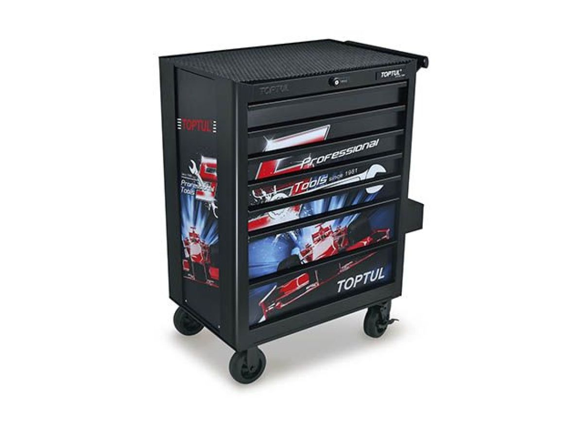 Тележка для инструмента 7 секций TOPTUL (TCAQ0707) предназначена для хранения различных инструментов. Позволяет рационально организовать рабочее место и сделать его более функциональным и удобным. Универсальная, компактная, мобильная, и может быть установлена в любом месте гаража или мастерской. Выдвижные ящики (5 средних (580х377х75 мм) и 2 больших (580х377х155 мм) ящика с центральным замком) на шарикоподшипниках с механизмом возвратной пружины с плавным закрыванием (ящики полностью выдвигаются на 100%). Сбрасываемый 4-цифровой кодовый замок обеспечивает доступ без ключа для хранения различных инструментов. Статическая грузоподъемность - 540 кг. Грузоподъемность на ящик - 30 кг. Покрытие верхнего стола из материала eva толщиной 9 мм.