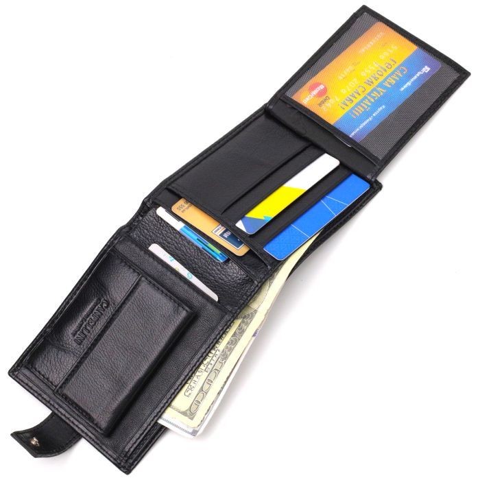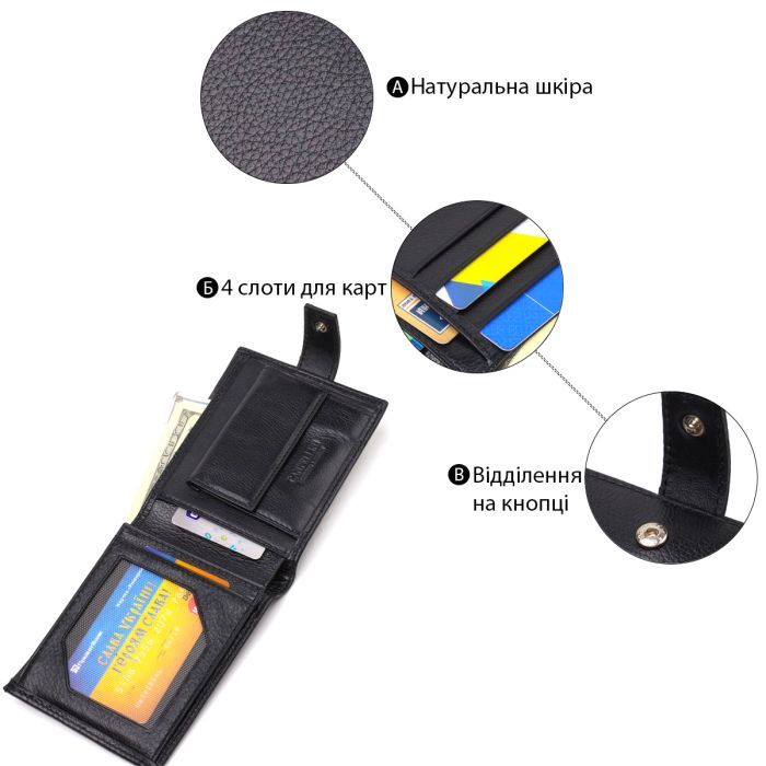 • Особливості закривається на хлястик з кнопкою , для карт , з монетницею , прилеглі кишені , сітчаста кишеня , подвійне складання