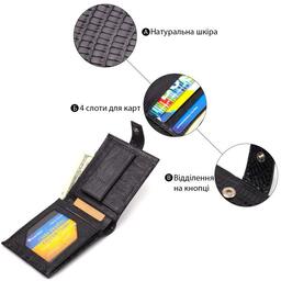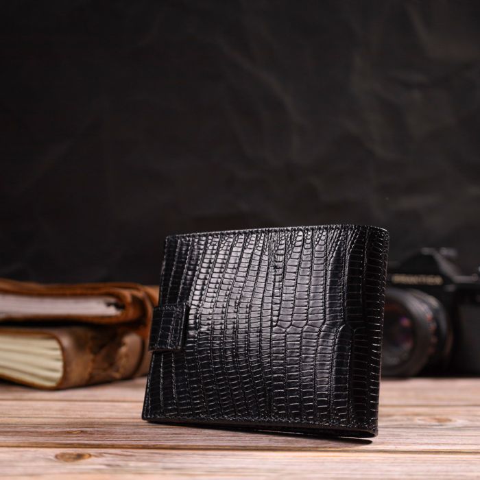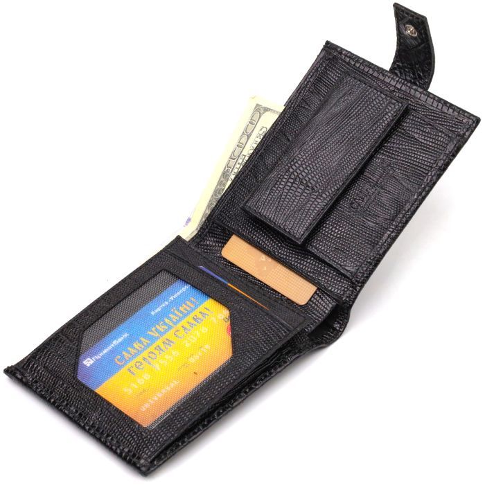 • Особливості з тисненням , для карт , з монетницею , прилеглі кишені , закривається на хлястик з кнопкою , сітчаста кишеня , подвійне складання