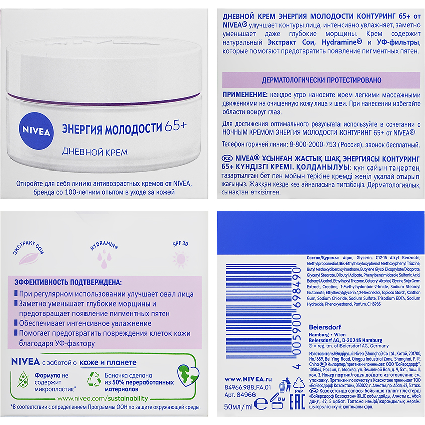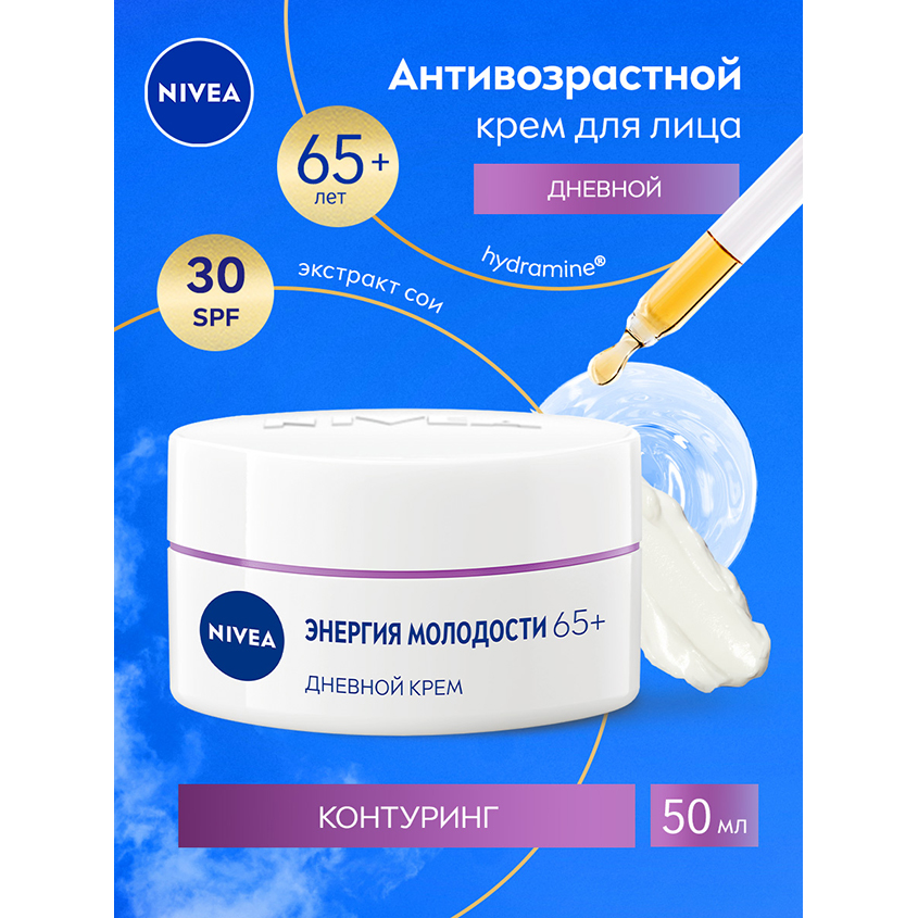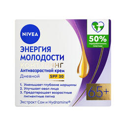 Дневной крем «Энергия Молодости» Контуринг 65+ с SPF 30 от бренда NIVEA улучшает овал лица, заметно сокращает глубокие морщины и обеспечивает интенсивное увлажнение. Крем для лица содержит натуральный экстракт сои, hydramine и УФ-фильтры, которые защищают от солнца и помогают предотвратить появление пигментных пятен.