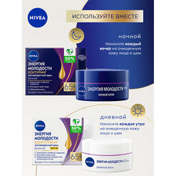 Применение: каждое утро наносите крем легкими массажными движениями на очищенную кожу лица и шеи. При нанесении избегайте область вокруг глаз. Для достижение оптимального результата используйте в сочетании с ночным кремом «Энергия Молодости» Контуринг 65+ от NIVEA.