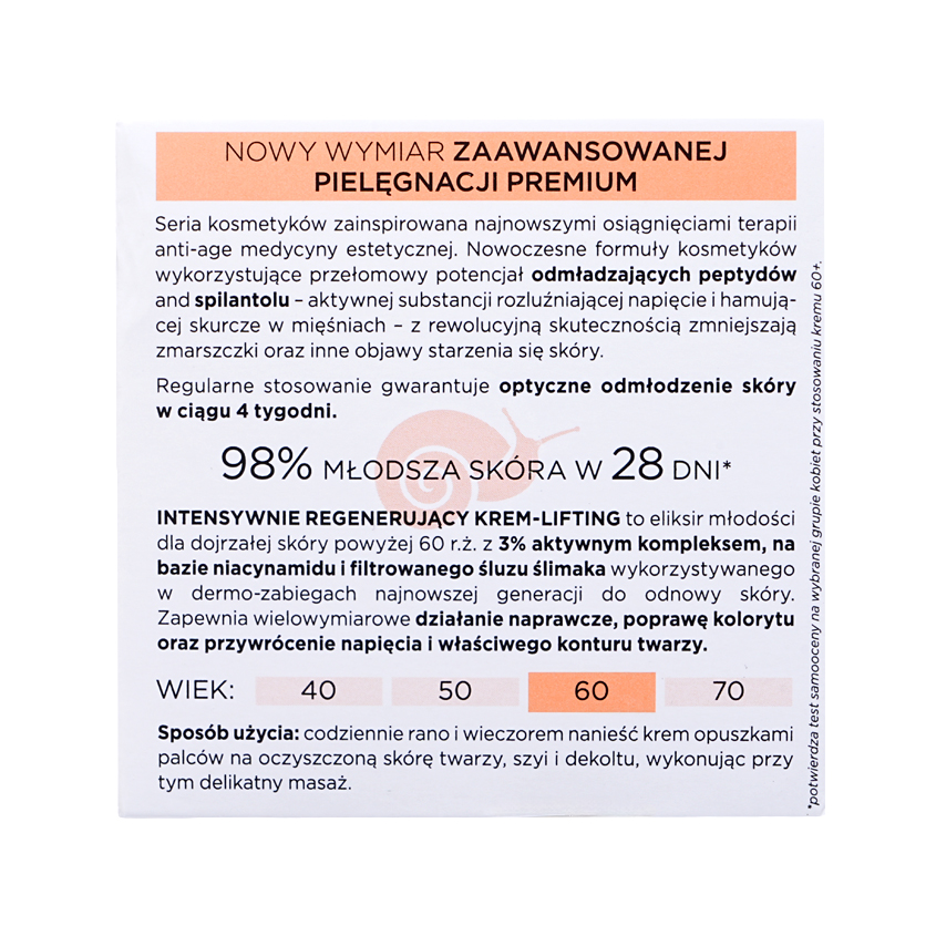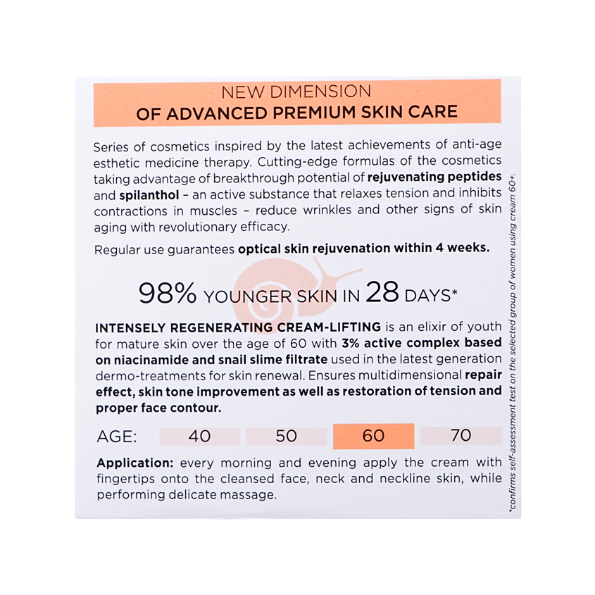 ИНТЕНСИВНО РЕГЕНЕРИРУЮЩИЙ КРЕМ-ЛИФТИНГ рекомендуется для ежедневного ухода за зрелой кожей старше 60 лет. Благодаря содержанию 3% активного комплекса на основе ниацинамида, спилантола и экстракта улиточной слизи, крем обладает комплексными восстанавливающими эффектами, выравнивает тон кожи, плотность, упругость и корректирует контур лица!
