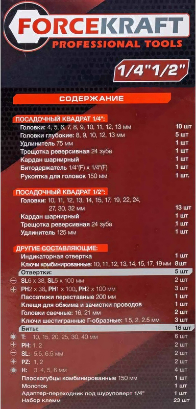 • Оснастка головки (28 шт.), насадки-биты (16 шт.), удлинители (2 шт.), кардан (2 шт.), держатель (1 шт.)