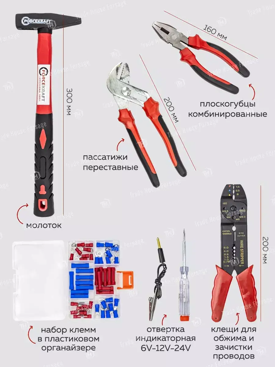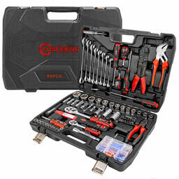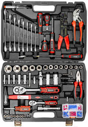 • Инструменты в наборе трещотка (2 шт.), отвертка (6 шт.), клещи (1 шт.), пассатижи (1 шт.), плоскогубцы (1 шт.), молоток (1 шт.), ключ гаечный (11 шт.)