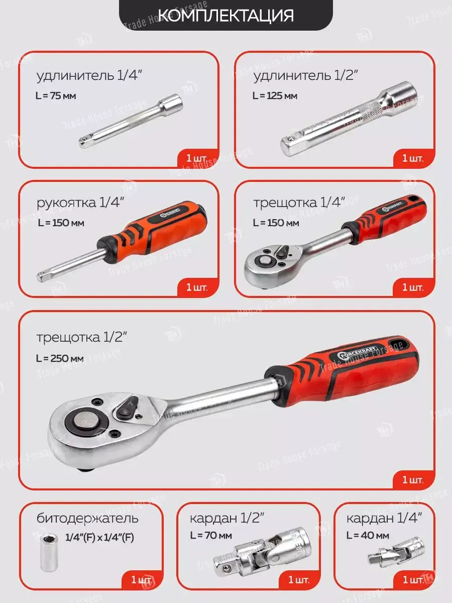 • Торцевые головки 1/2" (10, 11, 12, 13, 14, 15, 17, 19, 22, 24, 27, 30, 32 мм), 1/4" (4, 5, 6, 7, 8, 9, 10, 11, 12, 13 мм)