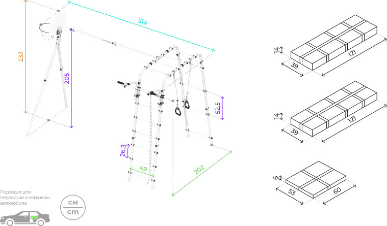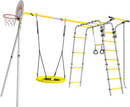 - Элементы в комплекте баскетбольная корзина, канат, качели, кольца (с перекладиной), лестница, турник, рукоход
