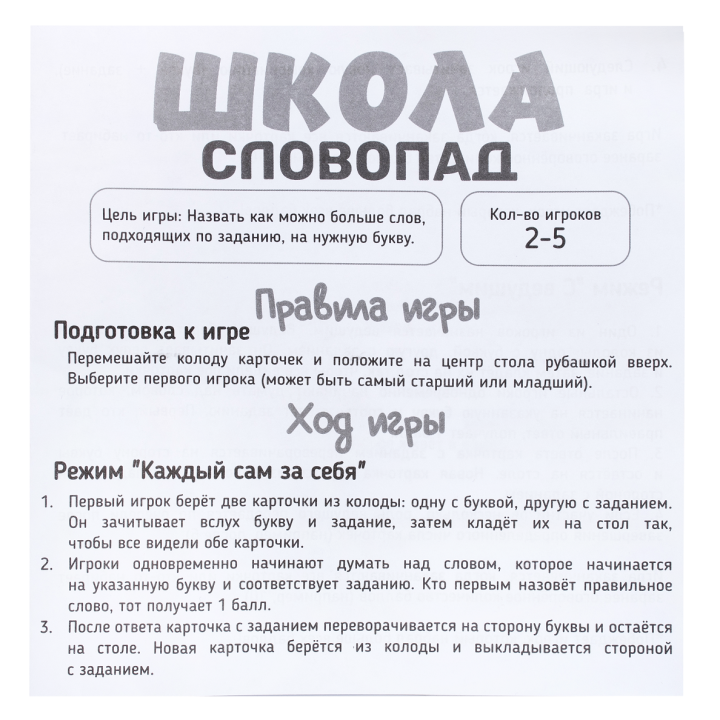 Комплектация: 60 двусторонних карточек (буквы + задания), правила