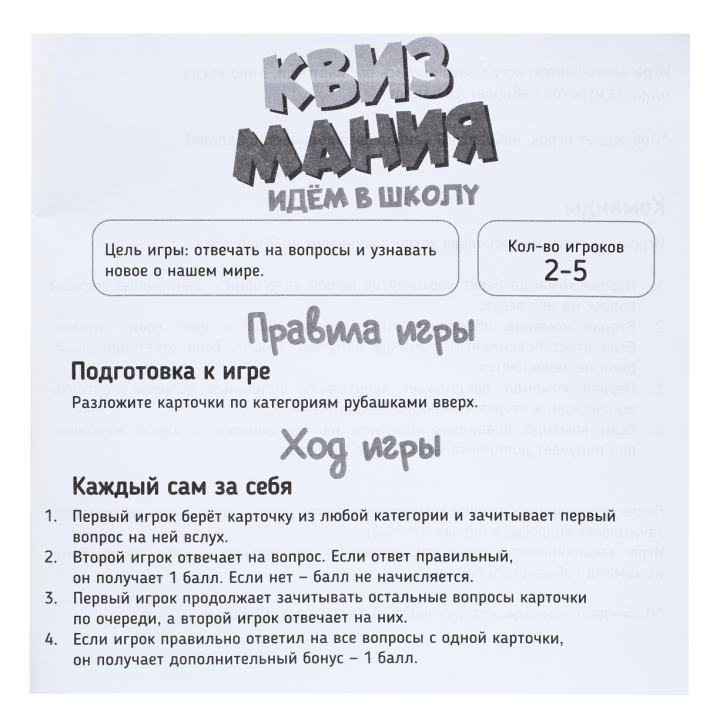 "Квизмания. Идем в школу" — это увлекательная настольная игра, которая поможет ребёнку подготовиться к школе в игровой форме. Вопросы охватывают ключевые темы школьной программы, делая обучение весёлым и интересным. Игра развивает эрудицию, логику и умение работать в команде, а также укрепляет уверенность в своих знаниях.