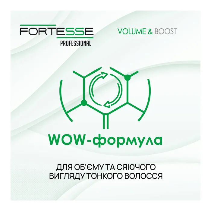 ЗастосуванняВимити волосся з шампунем Fortesse Pro Об'єм. Рівномірно розподіліть необхідну кількість засобу по всій довжині волосся. Зачекайте 5-10 хвилин і змийте теплою водою.