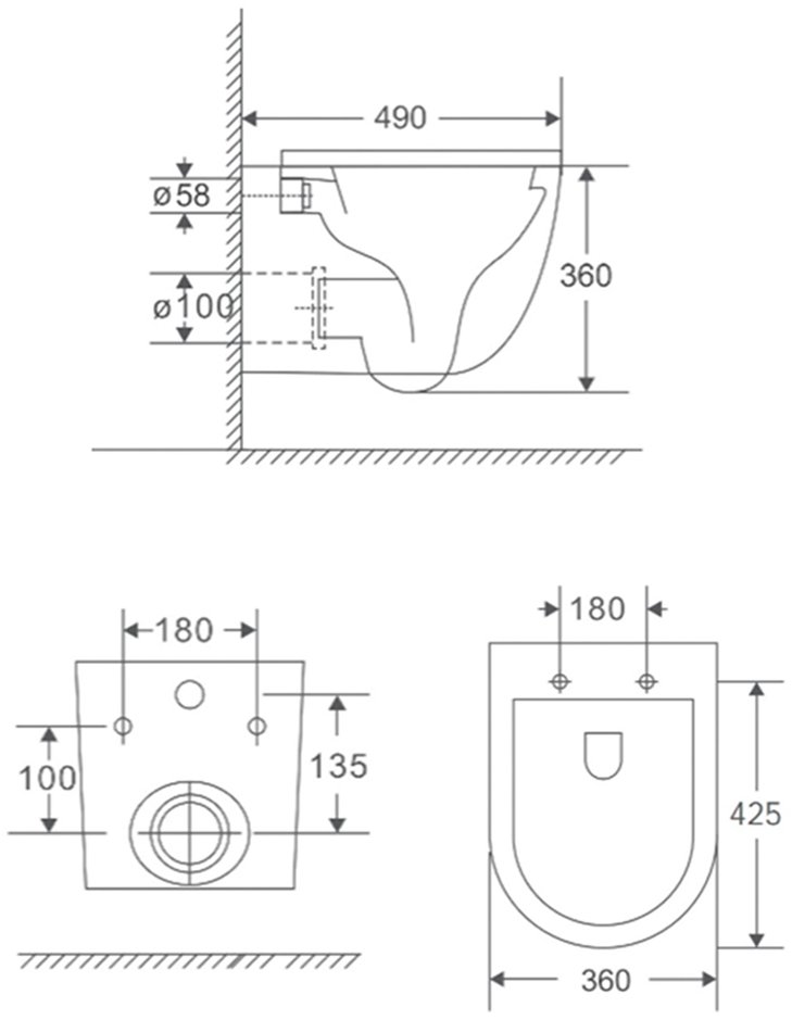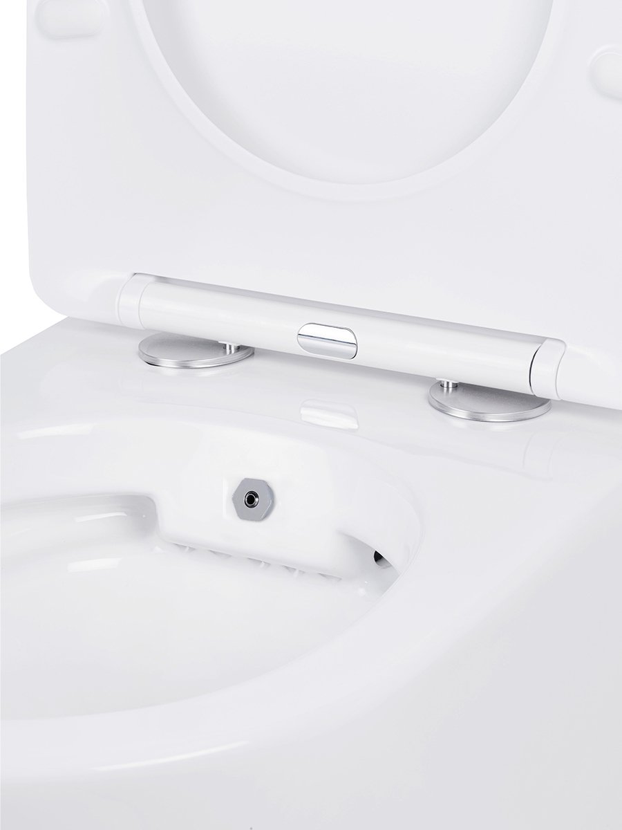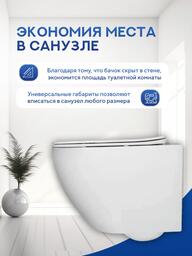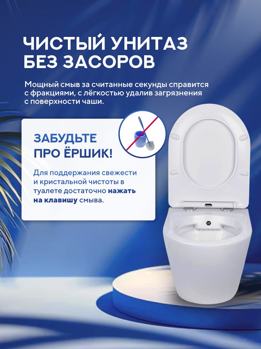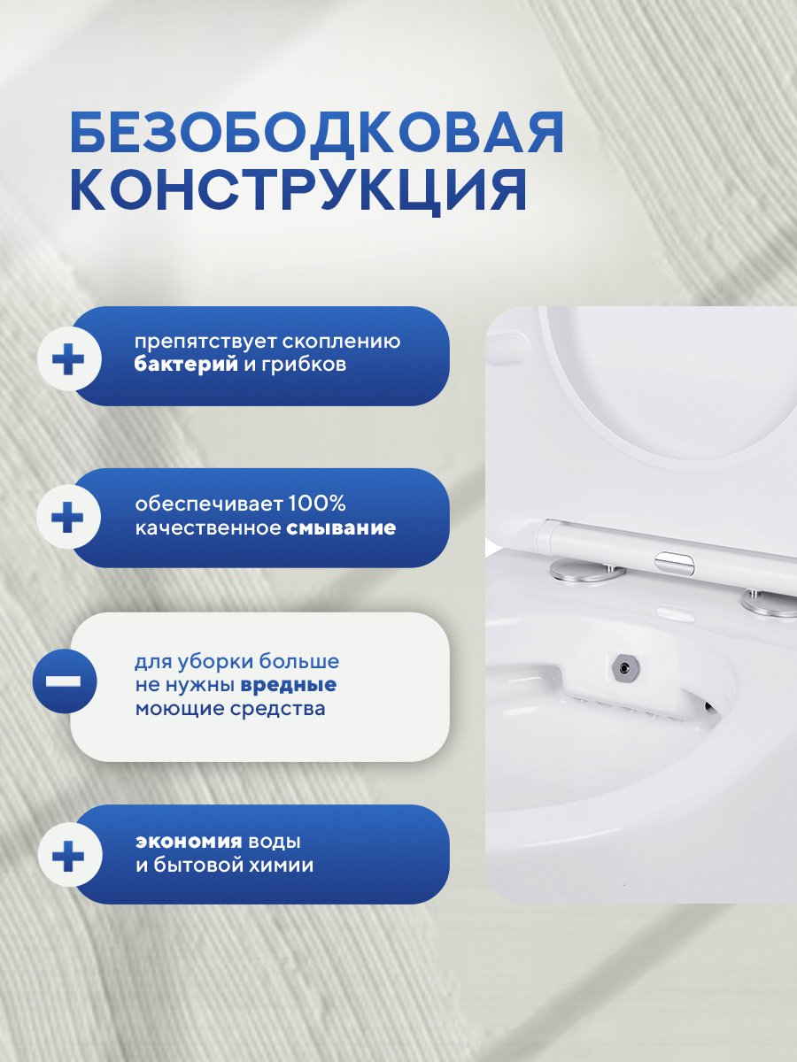 Безободковая конструкция препятствует скоплению бактерий и грибков, обеспечивает 100% качественное смывание, не требует моющих средств, экономит воду и бытовую химию;