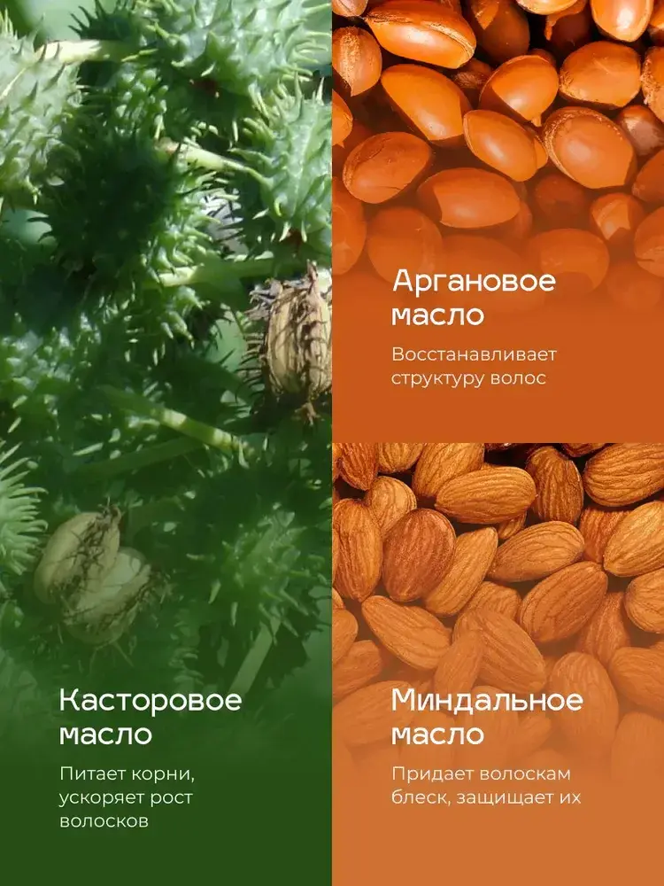 • Активные ингредиенты масло касторовое, масло арганы, масло миндаля, масло винограда, экстракт ромашки, витамин Е