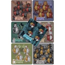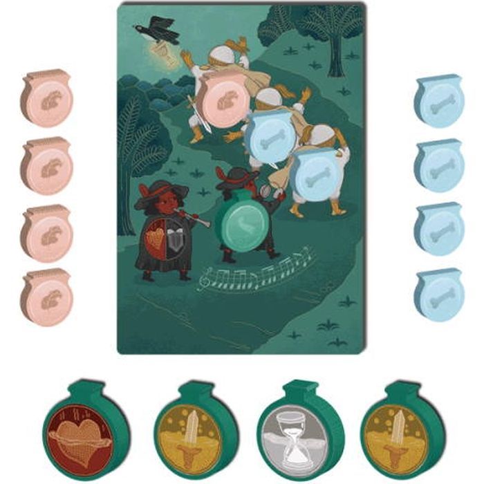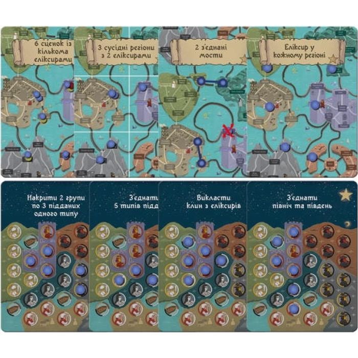 • Комплектація 36 карток сценок; 1 картка одиночної гри; 6 регіонів; 12 карток завдань; 6 карток-підказок; 6 зборищ; 5 фішок сценок; 6 мішечків для еліксирів; 24 фішки завдань; 120 еліксирів; правила гри.