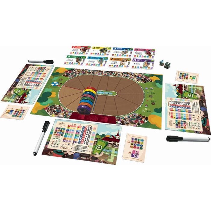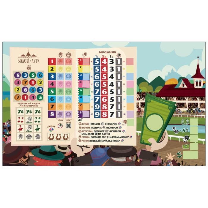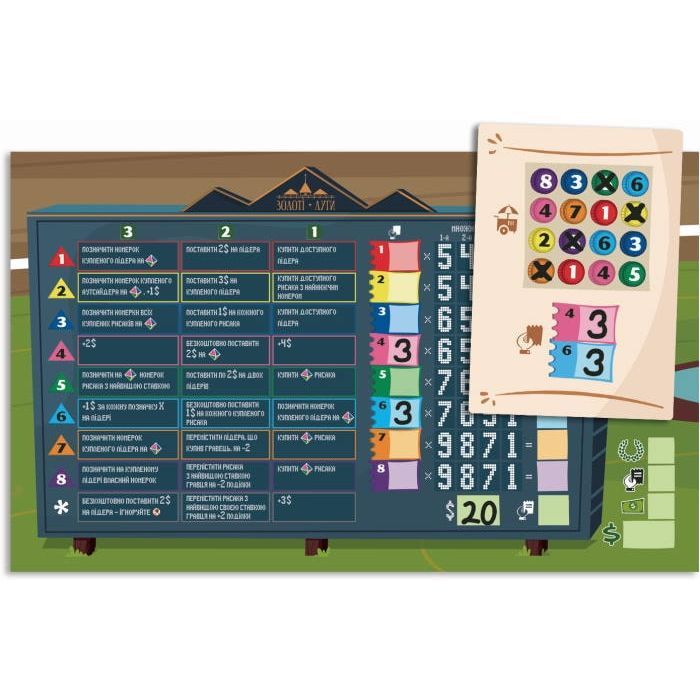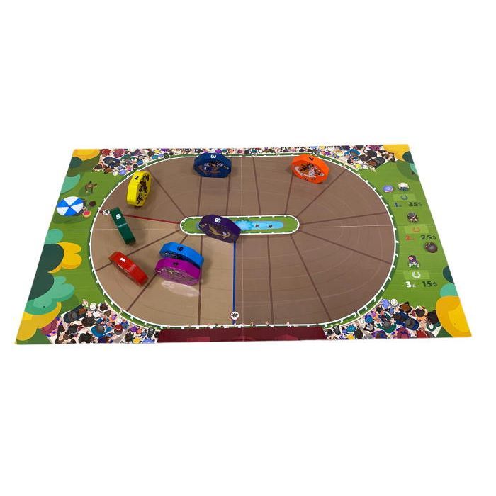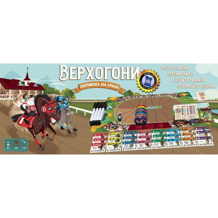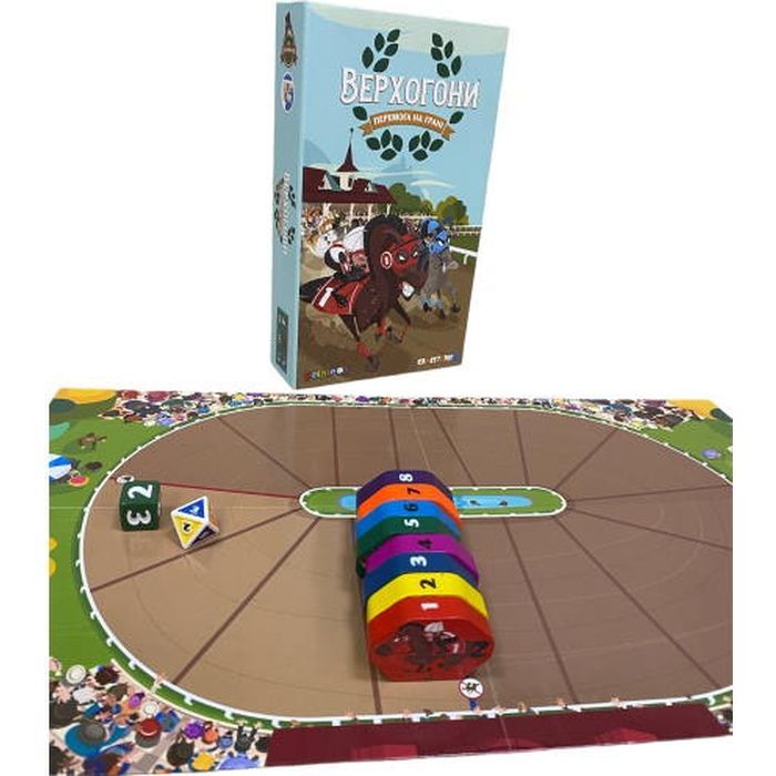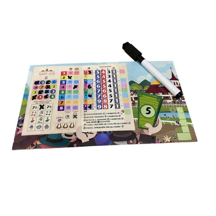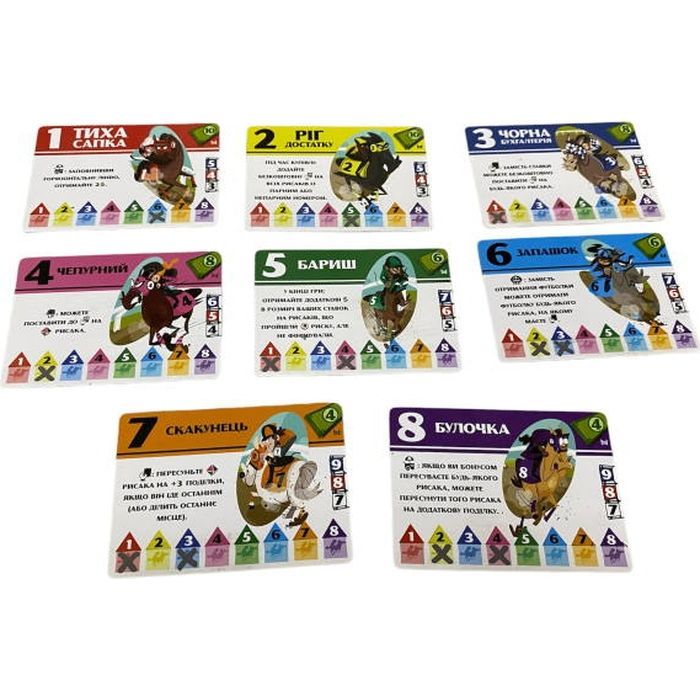 • Комплектація 1 іподром, 8 планшетів гравців, 8 фішок рисаків, 8 маркерів з гумкою, 8 стартових карток, 24 картки рисаків, 1 кубик рисаків, 1 кубик руху, 1 планшет самостійної гри