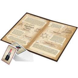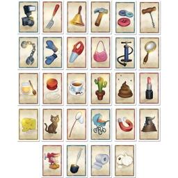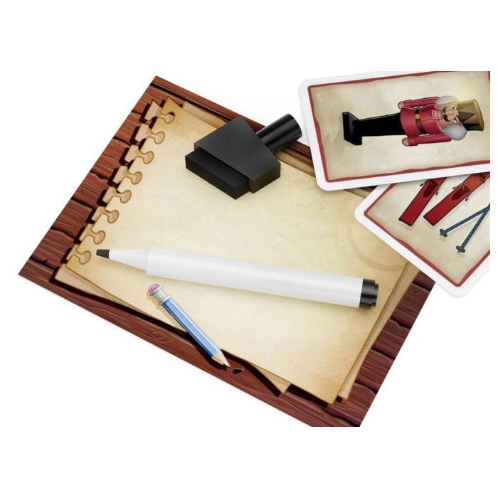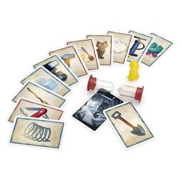 Комплектація110 карток предметів, книга пригод, ігрове поле, 3 жетони відповідей, планшет для записів та маркер, фігурка шукача пригод, пісковий годинник, правила гри