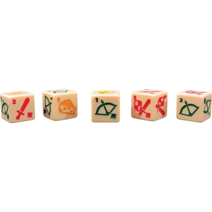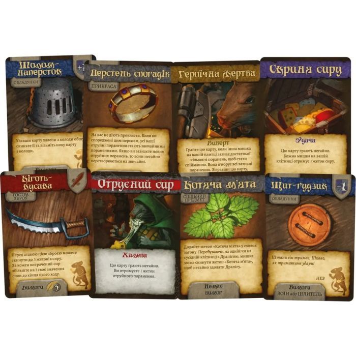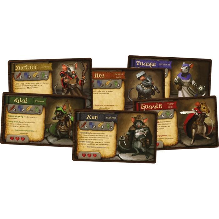 • Комплектація 6 фігурок мишок, 16 фігурок поплічників,1 планшет пригод, 8 двосторонніх плиток локацій, 28 карт умінь мишок, 71 карта обшуку, 18 карт зустрічей, 6 карт персонажів мишок, 5 кубиків дій, 3 картонні листи з жетонами, книга пригод, правила