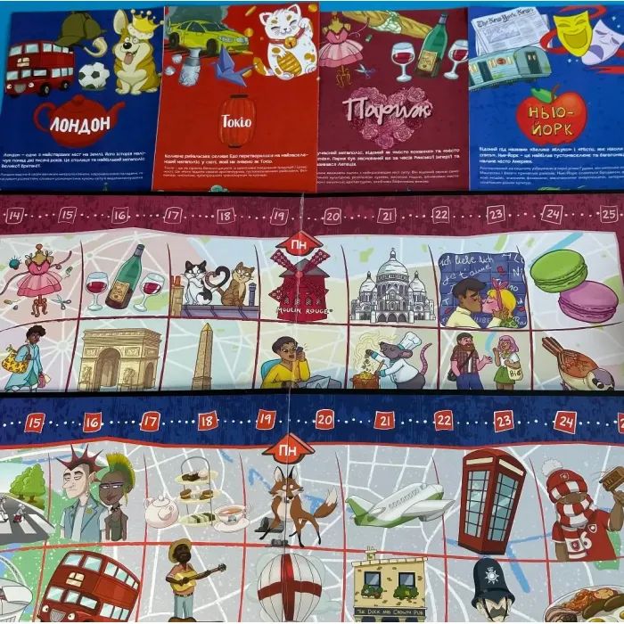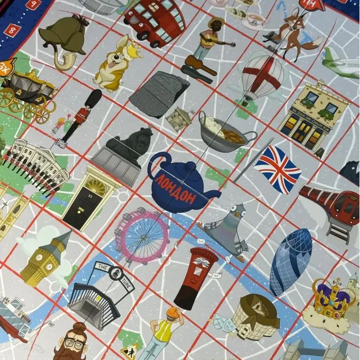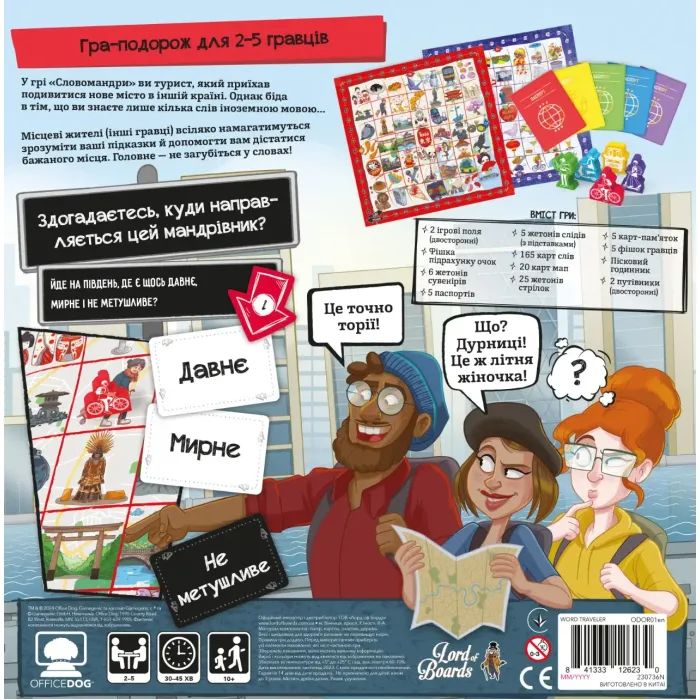 • Комплектація 165 карт слів, 1 фішка підрахунку очок, 5 паспортів, 5 фішок гравців, 2 ігрових поля, 25 фішок стрілок, 20 карт мапи, 5 карт з довідкою, 5 фішок слідів, 6 фішок сувенірів, пісочний годинник, 2 путівники, правила