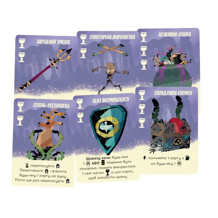 • Комплектація 4 лідери охоронців, 26 героїв охоронців, 6 карт долі, 1 маркер, 1 карта скверни, 18 жетонів скверни, 1 мішечок, 4 особливі бонусні герої, 6 двосторонніх карт артефактів, 18 жетонів артефактів, 4 особливі бонусні герої, правила гри