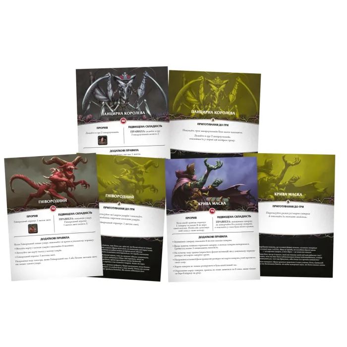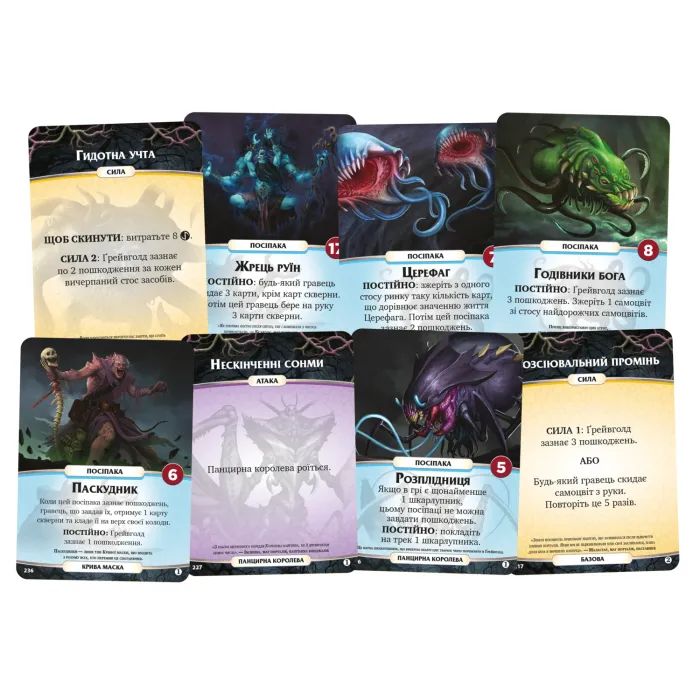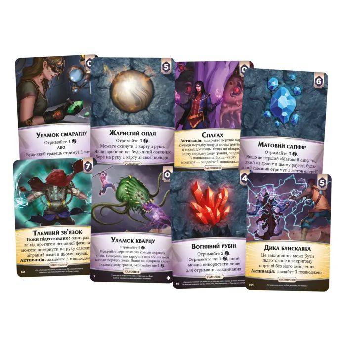 • Комплектація 30 жетонів життя зі значенням 1, 10 жетонів життя зі значенням 5, 21 жетон енергії, 10 жетонів сили, 15 жетонів люті / шкарлупників, 2 лічильники життів, 4 жетони номерів гравців, 87 карт самоцвітів, 86 карт заклинань, 30 карт артефактів, 27 карт модифіка