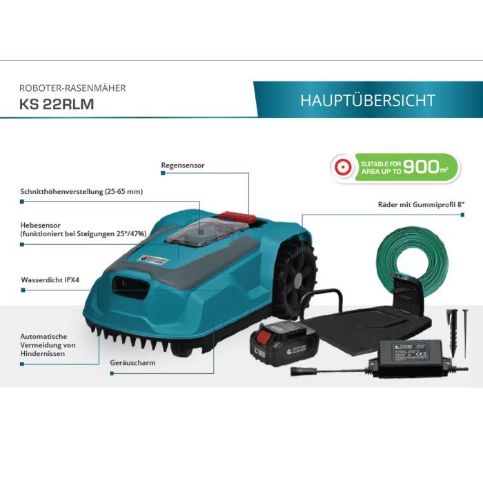 Робот-газонокосарка Konner&Sohnen KS 22RLM – це високоефективний пристрій на акумуляторах, призначений для догляду за газонами площею до 900 м², здатний працювати на схилах з кутом до 25 градусів. Пристрій має 8 рівнів висоти стрижки трави та оснащений функцією мульчування, що позбавляє необхідності збору трави. Завдяки повній автоматизації та можливості дистанційного керування через додаток, газонокосарка забезпечує бездоганний догляд за газоном без втручання користувача.