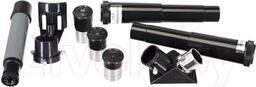 • В комплекте инструкция, зеркало, ручки, монтировка, тренога, окуляр, противовес, линза Барлоу, оптический искатель, штанга противовеса, оборачивающий окуляр