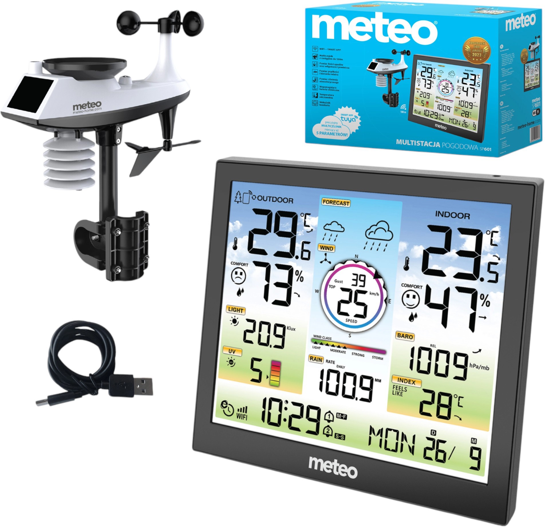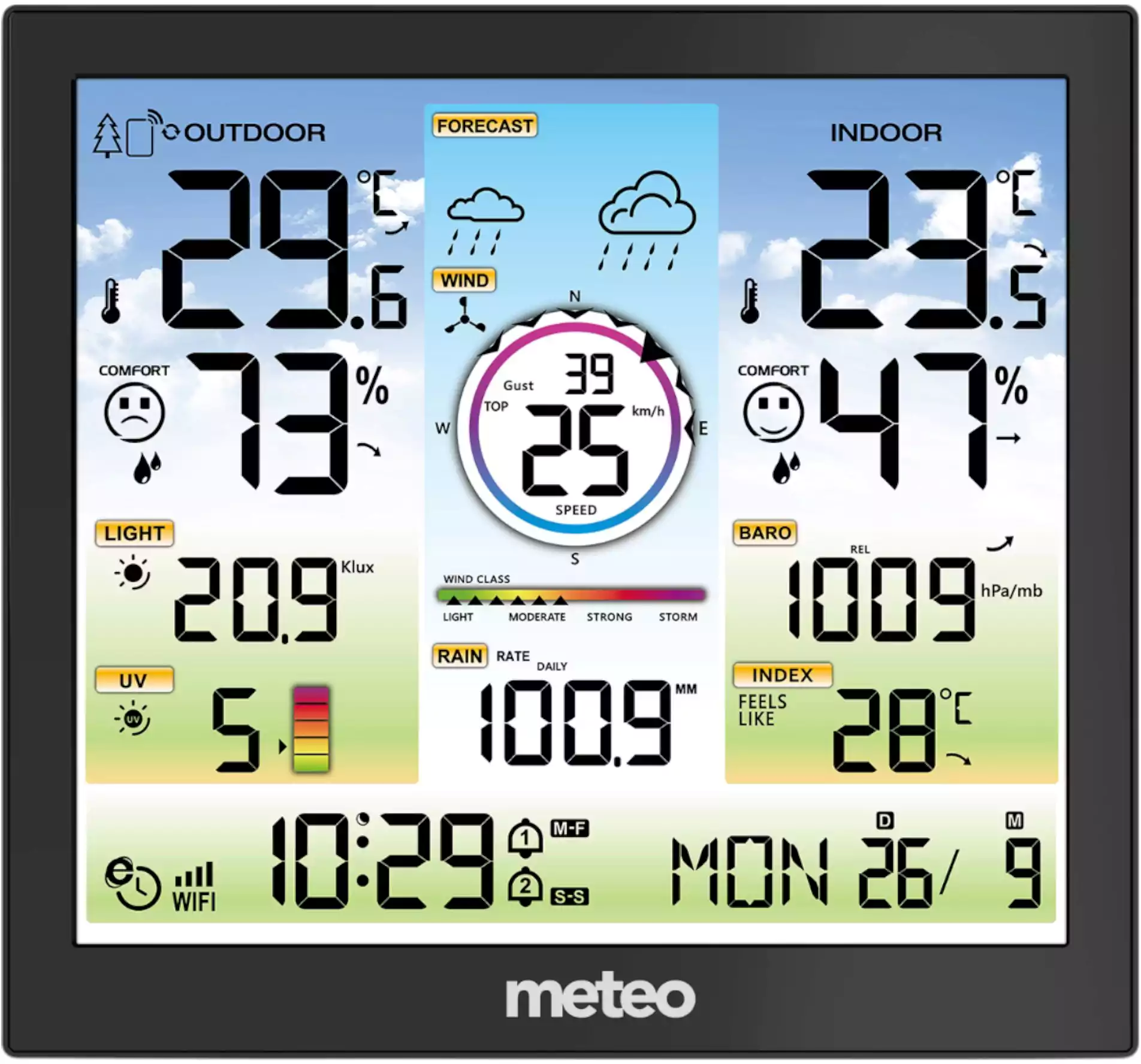 • Измерения прогноз погодывнутренняя температуравнешняя температуравнутренняя влажность / 20% ~ 95% /внешняя влажностьатмосферное давлениекачество воздухаскорость и направление ветра / 0 - 180 km/h, 0 - 359° /уровень осадков / 0 - 9999 mm /УФ излучениеинтенсивность внешнего освещения