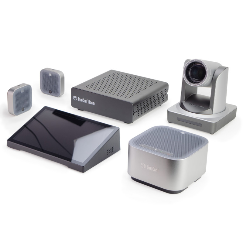 Благодаря данному комплекту вы сможете в кратчайшие сроки оборудовать SMART-переговорную для проведения видеоконференций. Комплект прост в подключении и эксплуатации. Камера передает качественное изображение и не занимает много места. За захват звука отвечает спикерфон, со встроенной системой шумоподавления, который прекрасно зарекомендовал себя при проведении конференций. Благодаря малому форм-фактору, отличным графическим возможностям и низкому уровню шума, ВКС кодек позволяет участникам конференции лучше сосредоточиться на обсуждении вопросов. TrueConf Room — передовое программное решение для переговорных комнат. Для управления TrueConf Room используется планшет, все действия по управлению терминалом осуществляются через веб-интерфейс - он полностью моделирует внешний вид клиентского приложения TrueConf, что позволит сразу же приступить к его использованию. TrueConf Room может использоваться, как с выделенным сервером видеосвязи TrueConf Server, так и с облачным сервисом TrueConf Online.