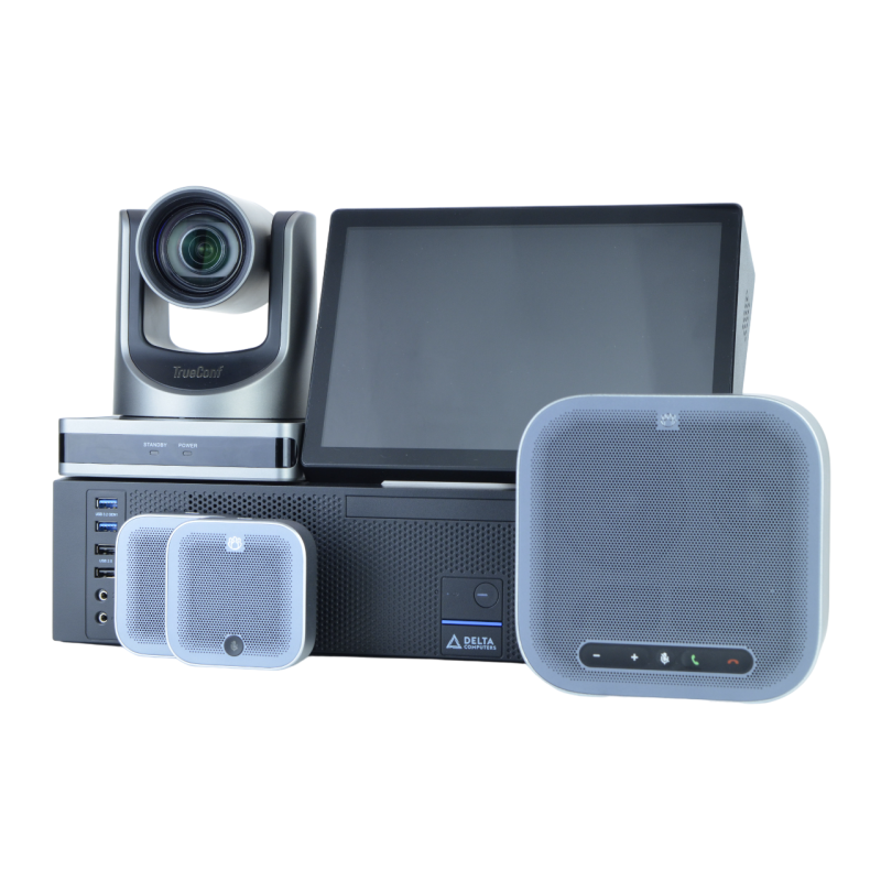 TrueConf Room-Delta - готовое решение для оснащения переговорной комнаты на основе TrueConf Room. Комплект состоит из PTZ-камеры, ПК Delta Бобёр, спикерфона, настольного планшета с поддержкой функции PoE (технология одновременной зарядки и передачи информации по одному и тому же кабелю) и предустановленного программного обеспечения TrueConf Room обеспечит качественное и комфортное общение участников конференции.