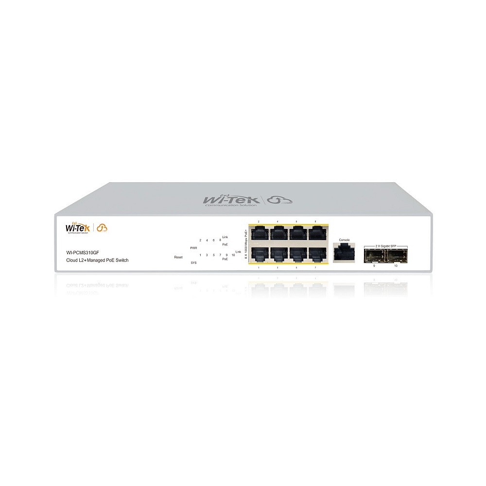 Управляемый PoE-коммутатор WI-PCMS310GF (v2) оснащен 8 GE POE портами и 2 портами SFP.