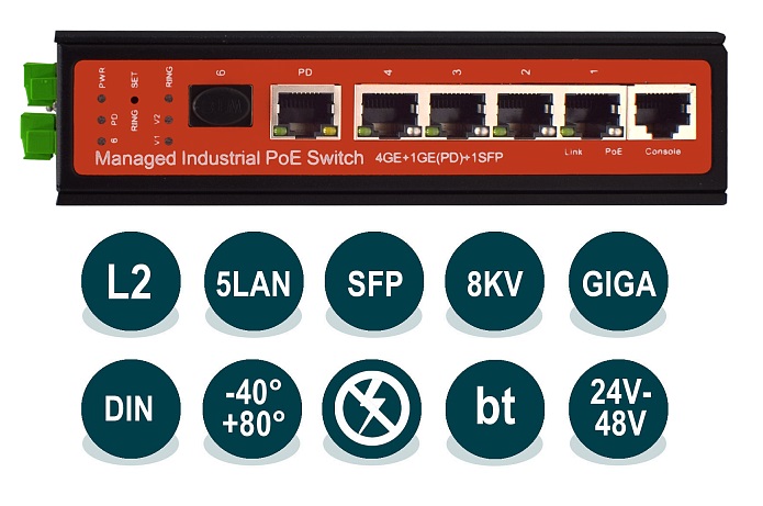 Коммутатор поддерживает обширный спектр стандартов PoE IEEE802.3at/af/bt и Passive PoE , позволяя подключать различных потребителей, с мощностью до 60Вт , с номиналом напряжения 24В и 48В , таких как IP-камеры, WiFi мосты, домофоны, вызывные панели или другие совместимые PoE устройства.