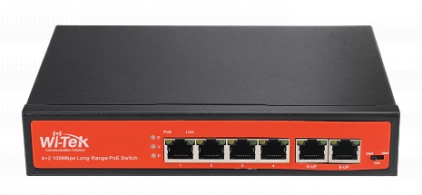 Коммутатор оснащен 6 портами 100Base-TX , из которых 3 поддерживают 802.3af/at (PoE, PoE+) и 1 порт поддерживает 802.3bt (HiPoE).