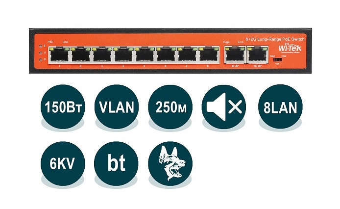 Коммутатор оснащен 7 портами 100Base-TX с поддержкой 802.3af/at (PoE, PoE+), 1 портом 100Base-TX с поддержкой 802.3bt (HiPoE) и 2 портами 1000Base-T