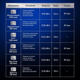 Основные программыделикатная мойка,фрукты,ECO,интенсивная мойка,ежедневная