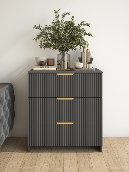 Представляем вашему вниманию Комод Вельвет с 3 ящиками в элегантном графитовом цвете. Этот комод станет идеальным дополнением к вашему современному интерьеру, сочетая в себе стиль и функциональность.