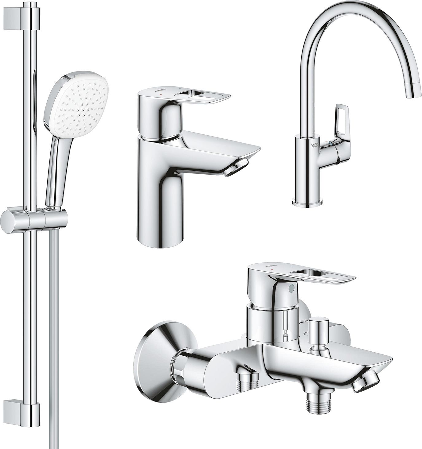 • Комплектация смеситель для умывальника / Grohe BauLoop 23337001 /смеситель для кухни / Grohe BauLoop 31232001 /смеситель для ванны и душа / Grohe BauLoop 23603001 /душевой гарнитур / Grohe Tempesta Cube 110 26748003 /стойка