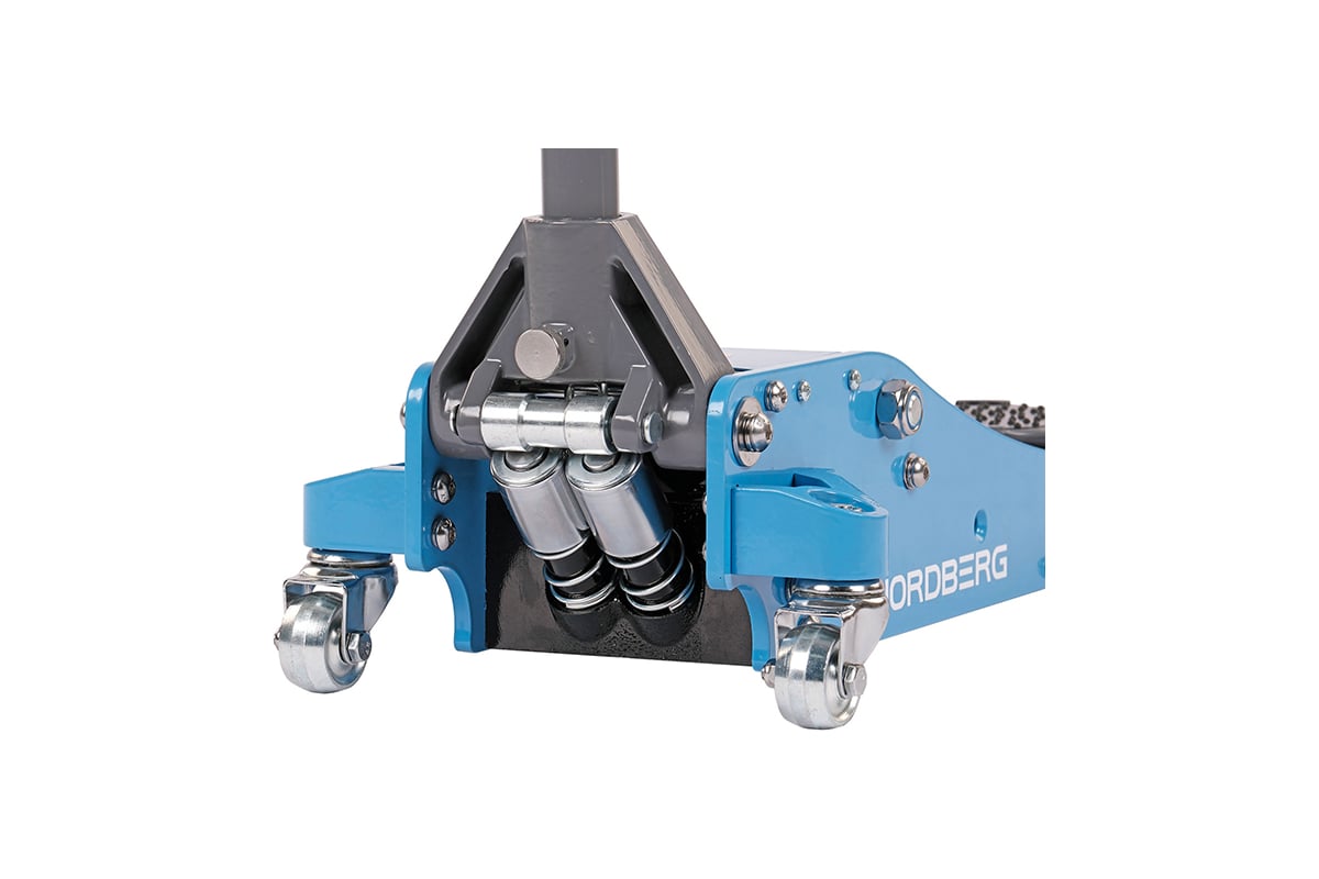 Маневренные поворотные задние колеса (вращение 360°) облегчают перемещение домкрата по гаражу.