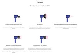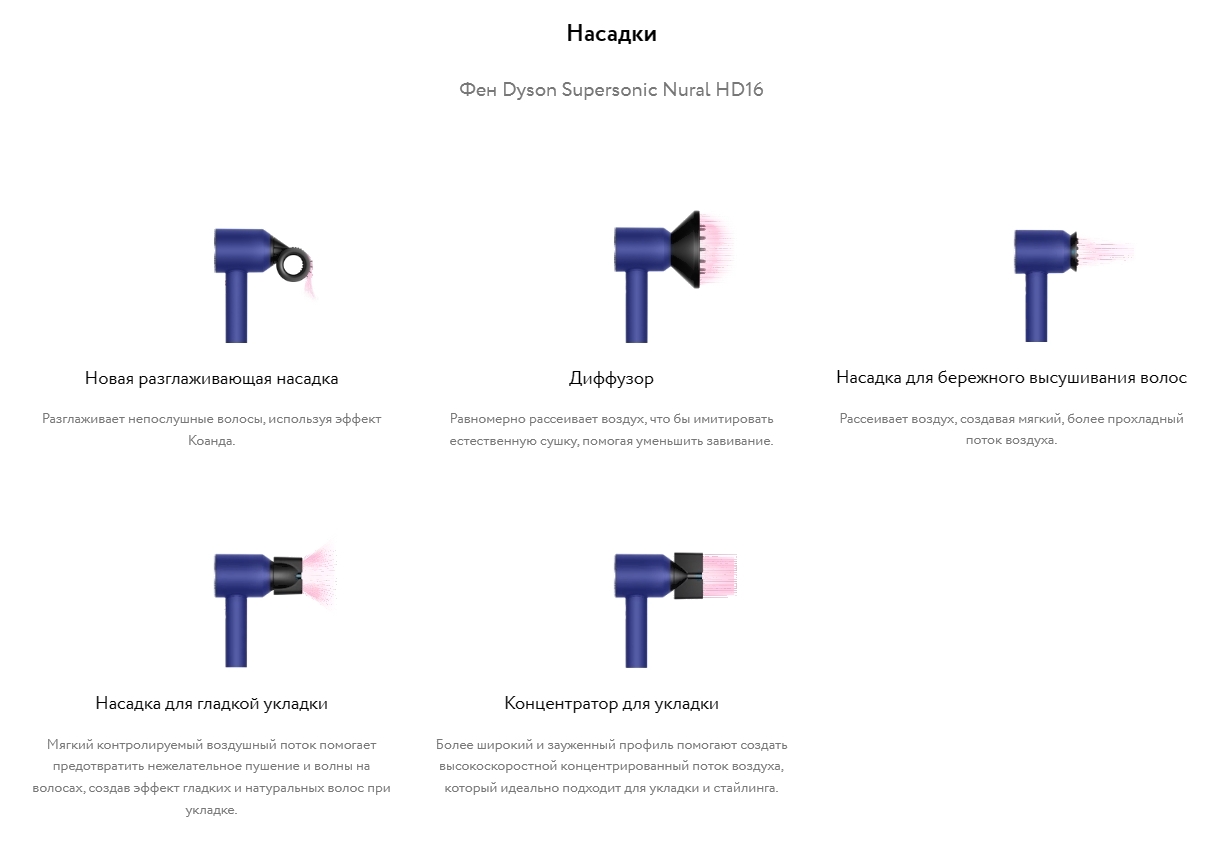 • Насадки разглаживающая щетка, диффузор, насадка для бережного высушивания, концентратор (2 шт.)