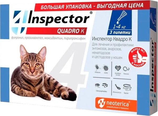 - Защита от блох, от клещей иксодовых, от власоедов, от вшей, от клещей чесоточных, от клещей ушных, от круглых гельминтов, от ленточных гельминтов, от дирофиляриоза, от комаров, от мух, от личинок гельминтов Показать полностью