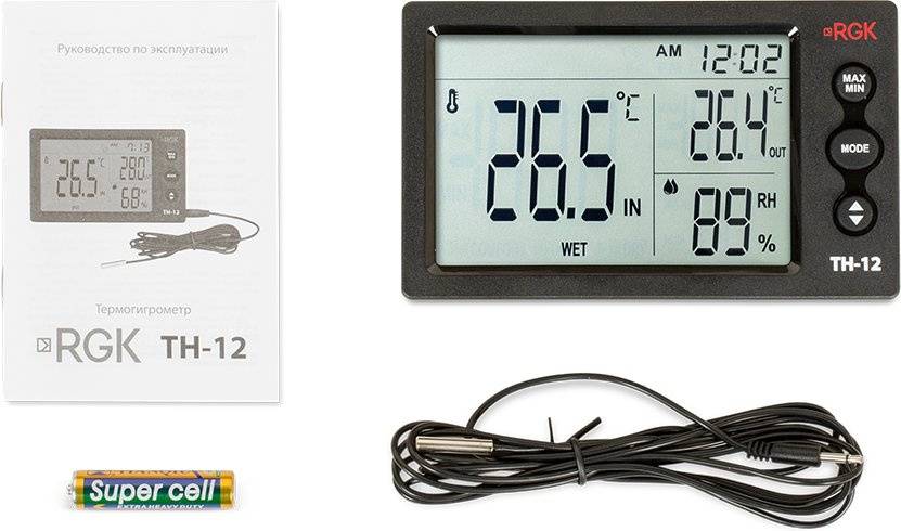 Комплект поставкиТермогигрометр, батарейка ААА, руководство по эксплуатации, внешний датчик, упаковка.