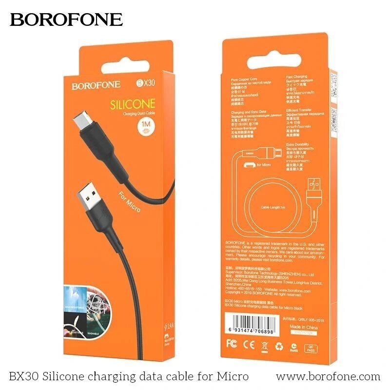 Дата-кабель BOROFONE BX30 Micro (1м., силиконовый, 2,4A), цвет: чёрный