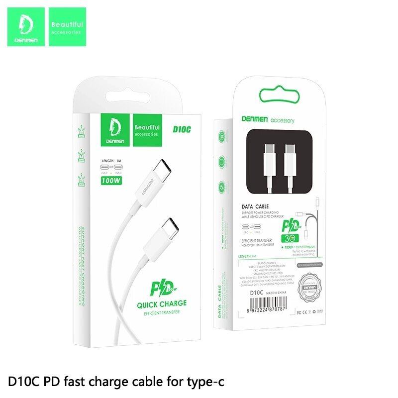 Дата-кабель Denmen D10C Type C to Type C (1м, PD 100W) цвет: белый