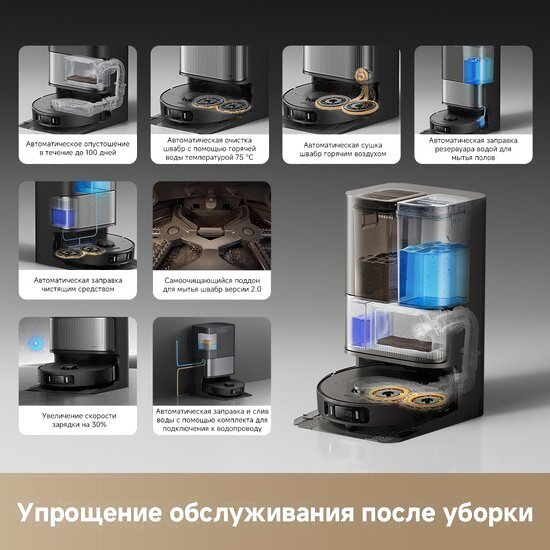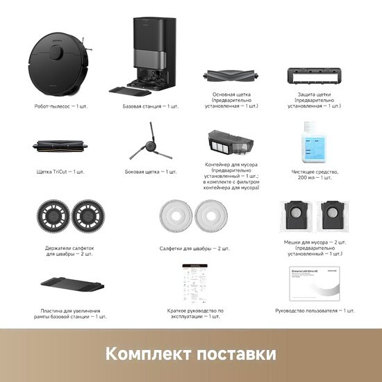 В комплектемешок для мусора, документация, сетевой кабель, держатель, контейнер-пылесборник, боковая щетка, основная щетка, салфетки, зарядная станция, моющее средство