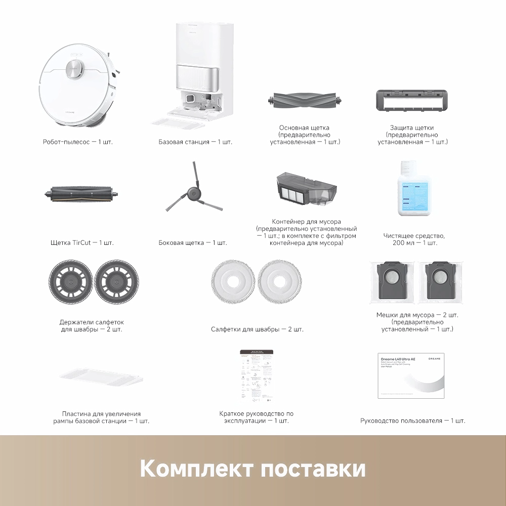В комплектемешок для мусора, документация, сетевой кабель, держатель, контейнер-пылесборник, боковая щетка, основная щетка, салфетки, зарядная станция, моющее средство