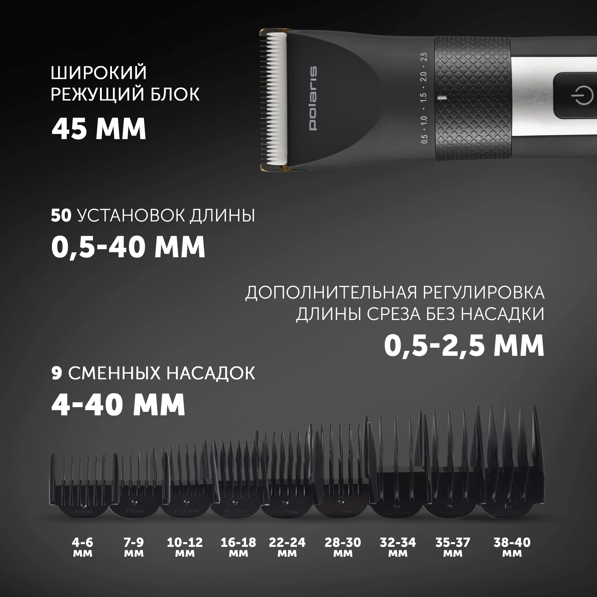 • Установка длины волос от 0.5 до 40 мм