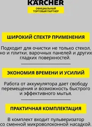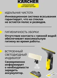• Комплектация Зарядное устройство; флакон-пульверизатор с обтяжкой из микроволокна; широкая всасывающая насадка - 280 мм; узкая всасывающая насадка - 170 мм; концентрат для мойки окон.