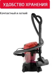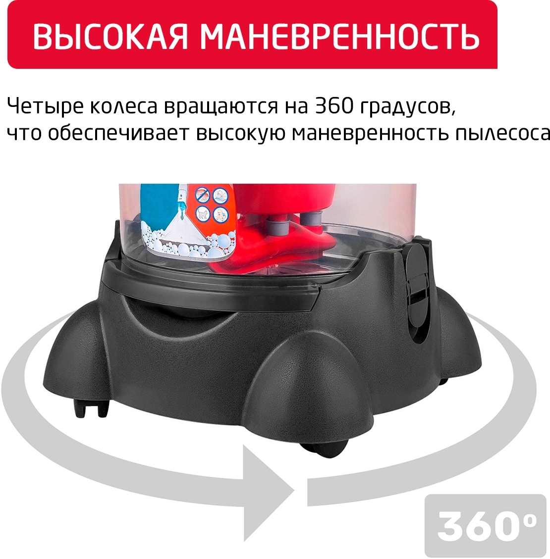 Особенности пылесосалегко очищаемый пылесборник, поворачивающиеся колеса, шланг