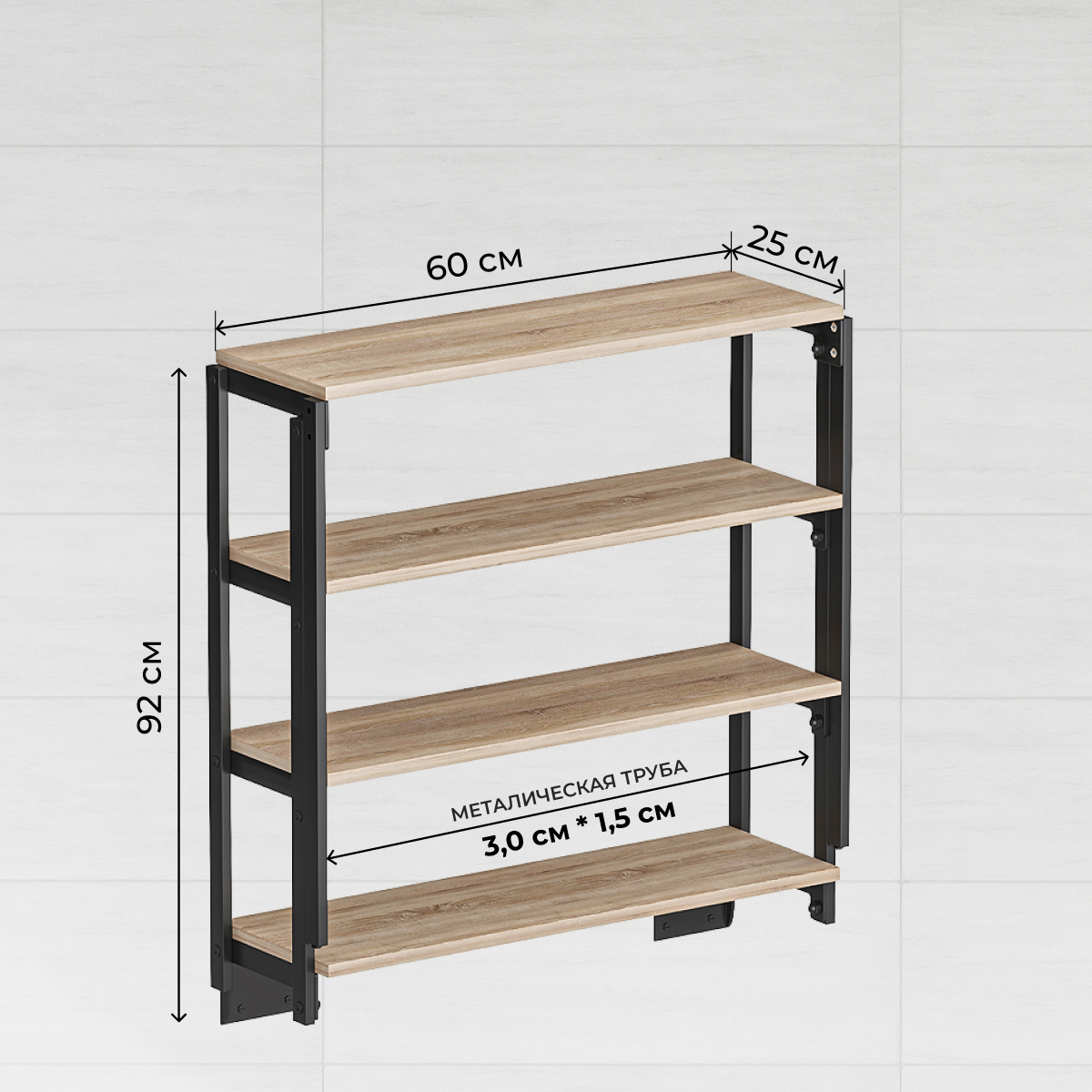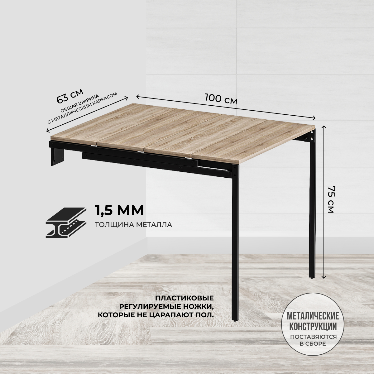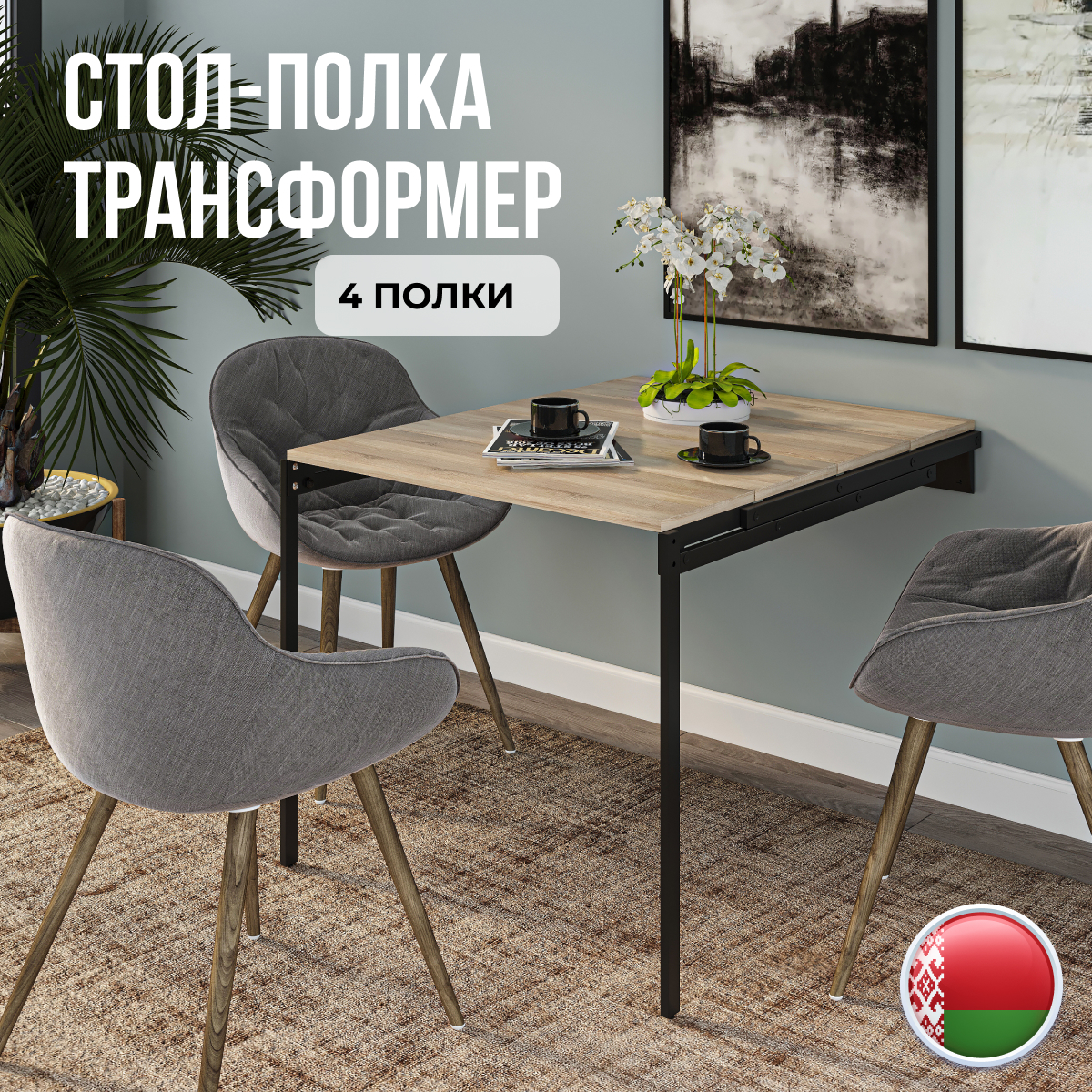 Стол-трансформер на 4 полки - идеальное решение для ценителей комфорта и функциональности. Размер стола в разложенном виде составляет 63*100 см с высотой 75 см. Размер полок в собранном виде – 63*25*92 см. Он идеально подходит для различных помещений: маленькой кухни, спальни или даже балкона. Этот раскладной стол обладает уникальными свойствами, которые позволяют ему преобразовываться и адаптироваться под любые потребности. Конструкция раскладного механизма позволяет не убирать предметы с полок. В момент раскладывания они не помешают и останутся на своих местах. Детали стола изготовлены из ДСП толщиной 18 мм с ПВХ-кромкой 1 мм. Это обеспечивает превосходную прочность и долговечность, позволяя наслаждаться красотой и функциональностью стола на протяжении многих лет. Металлический каркас из трубы 3*1,5 см с порошковым покрытием устойчив к царапинам, что гарантирует его сохранность даже при активном использовании. Навесной стол произведён в Беларуси и является примером высокого качества