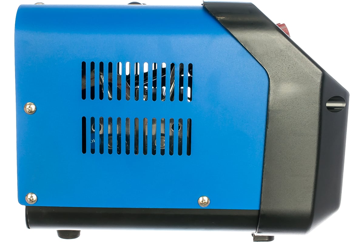 Конструкция имеет небольшие размеры и вес, оснащается удобной рукояткой для транспортировки. Корпус обладает защитой IP20, есть защищенность от пробоя. В передней части располагается специальный карман для хранения проводов.