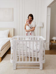 Детская кровать-трансформер MOMMY LOVE™ - это практичное и функциональное решение для растущих семей. Сочетая в себе уют и удобство, она идеально подходит для вашего малыша с самого рождения. Кровать поставляется с мягким мятником для люльки и комплектом расширения, который позволяет адаптировать кровать к потребностям растущего ребенка.